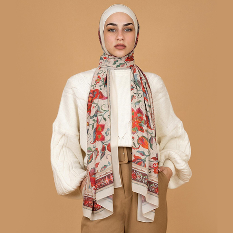Novo Design Floral Impresso Chiffon Lenço Hijab Exclusivo Muçulmano Chic Feminino Xales